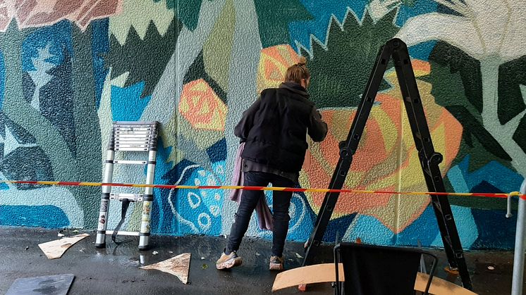 Ana-Carolina Fleming från Varberg målar i Valldatunneln mellan kyrkan och Toråsskolan. Ana har arbetat tillsammans med elever på Toråsskolan kring temat.