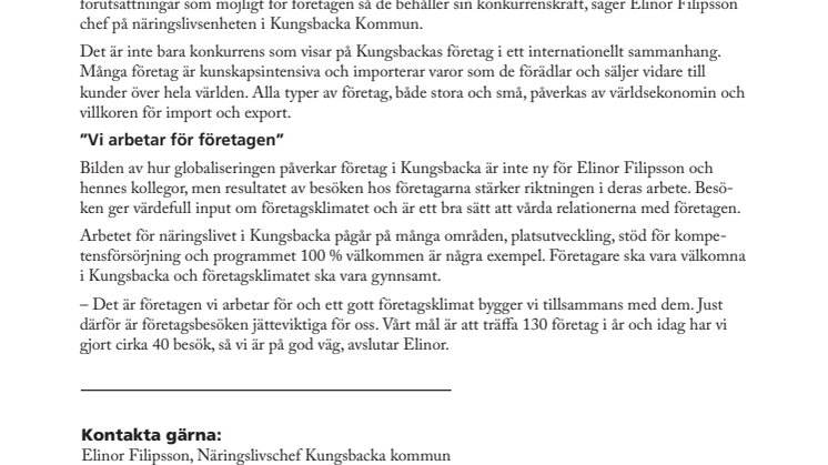 Bilden av hur globaliseringen påverkar företag i Kungsbacka är inte ny för Elinor Filipsson och hennes kollegor, men resultatet av besöken hos företagarna stärker riktningen i deras arbete. Besöken ger värdefull input om företagsklimatet och är ett bra sätt att vårda relationerna med företagen.