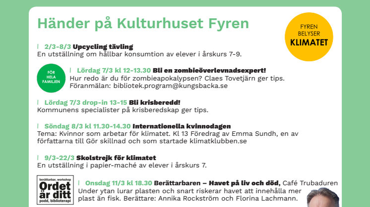 I mars uppmärksammar kulturhuset Fyren klimatet. Det blir massor av spännande aktiviteter, föredrag och utställningar på temat klimat.