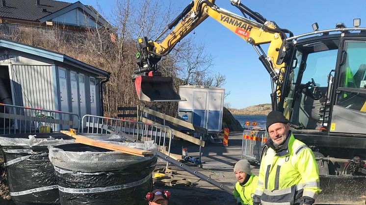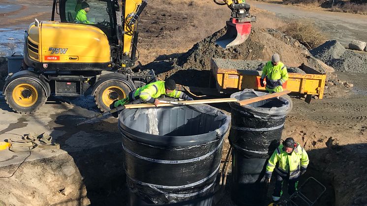 Nu ställer vi om avfallshanteringen från vanliga sopkärl till större kärl som grävs ner. Vi gräver ner kärl för vanliga sopor som är 5 kubikmeter stora och kärl för matavfall som rymmer 700 liter.
