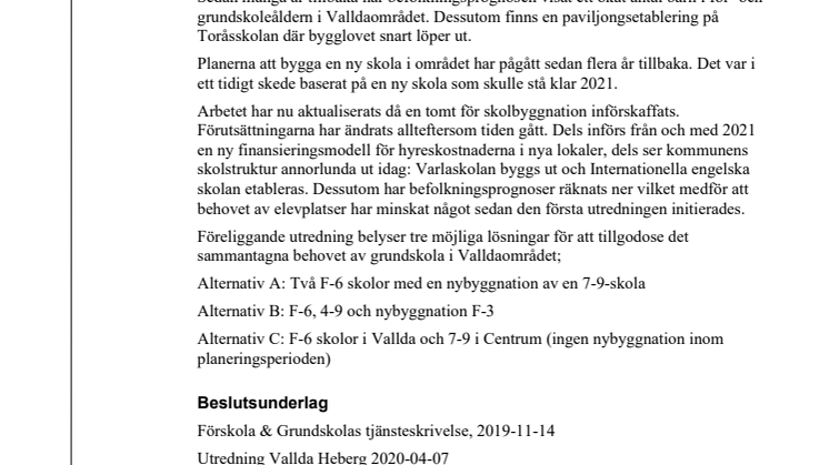 Utredningen ”Grundskola i Vallda Heberg” bifogas.