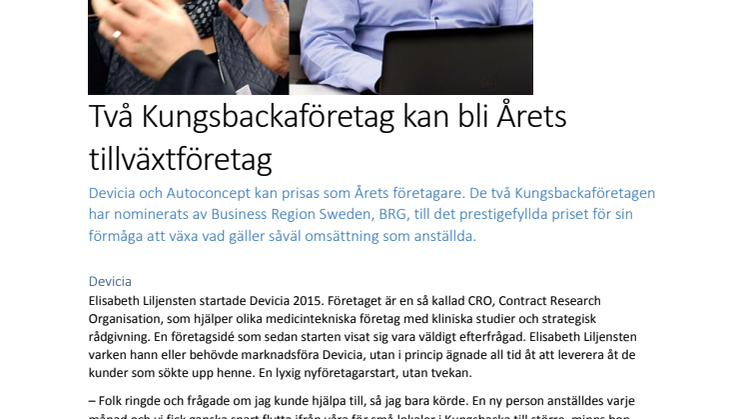 Devicia och Autoconcept kan prisas som Årets företagare. De två Kungsbackaföretagen har nominerats av Business Region Sweden, BRG, till det prestigefyllda priset för sin förmåga att växa vad gäller såväl omsättning som anställda.