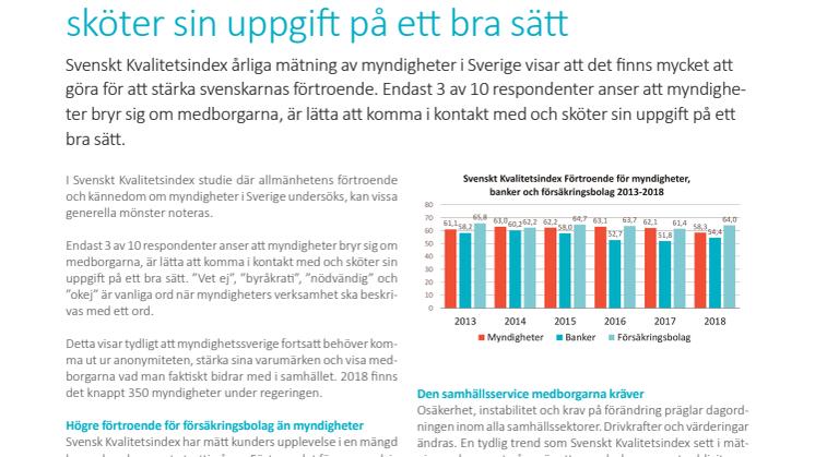 Svenskt Kvalitetsindex årliga mätning av myndigheter i Sverige visar att det finns mycket att göra för att stärka svenskarnas förtroende. Endast 3 av 10 respondenter anser att myndigheter bryr sig om medborgarna, är lätta att komma i kontakt med och sköter sin uppgift på ett bra sätt.