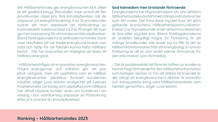 –Hållbarhetsfrågan är en paradox i energibranschen. Högre energipriser och inflation gör att pris blivit viktigare, men att uppfattas som en hållbar energileverantör påverkar fortsatt kundernas nöjdhet, säger Love Westin analyschef på Svenskt Kvalitetsindex. De bolag som uppfattas som hållbara har alltså nöjdare kunder, även om kunderna i sin vardag i stor utsträckning anpassar sin förbrukning efter pris snarare än klimatpåverkan.