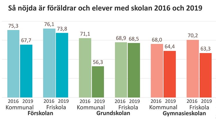 För eleverna på gymnasiet är nedgången i nöjdhetsresultaten minst och skillnaden mellan kommunala skolor och friskolor marginell. De kommunala gymnasieskolorna har något nöjdare elever.