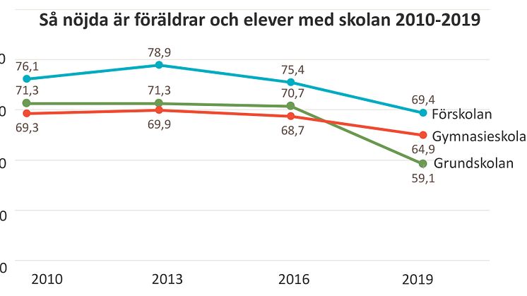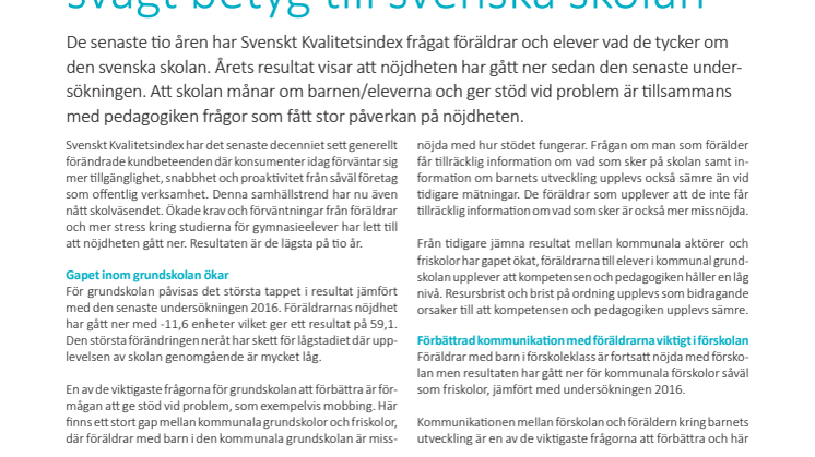 De senaste tio åren har Svenskt Kvalitetsindex frågat föräldrar och elever vad de tycker om den svenska skolan. Årets resultat visar att nöjdheten har gått ner sedan den senaste undersökningen. Att skolan månar om barnen/eleverna och ger stöd vid problem är tillsammans med pedagogiken frågor som fått stor påverkan på nöjdheten.