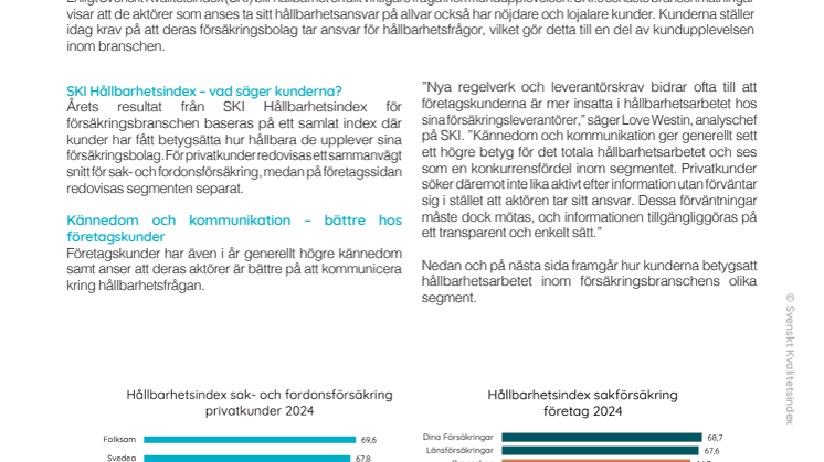 ”Nya regelverk och leverantörskrav bidrar ofta till att företagskunderna är mer insatta i hållbarhetsarbetet hos sina försäkringsleverantörer,” säger Love Westin, analyschef på SKI. ”Kännedom och kommunikation ger generellt sett ett högre betyg för det totala hållbarhetsarbetet och ses som en konkurrensfördel inom segmentet. Privatkunder söker däremot inte lika aktivt efter information utan förväntar sig i stället att aktören tar sitt ansvar. Dessa förväntningar måste dock mötas, och informationen tillgängliggöras på ett transparent och enkelt sätt.”