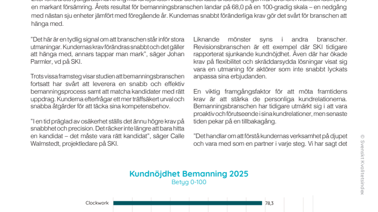 Efter förra årets tydliga återhämtning i kundnöjdheten visar den senaste undersökningen från Svenskt Kvalitetsindex (SKI) en markant försämring. Årets resultat för bemanningsbranschen landar på 68,0 på en 100-gradig skala – en nedgång med nästan sju enheter jämfört med föregående år. Kundernas snabbt föränderliga krav gör det svårt för branschen att hänga med.