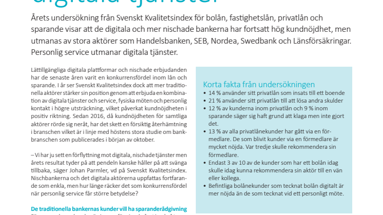 Årets undersökning från Svenskt Kvalitetsindex för bolån, fastighetslån, privatlån och sparande visar att de digitala och mer nischade bankerna har fortsatt hög kundnöjdhet, men utmanas av stora aktörer som Handelsbanken, SEB, Nordea, Swedbank och Länsförsäkringar. Personlig service utmanar digitala tjänster.