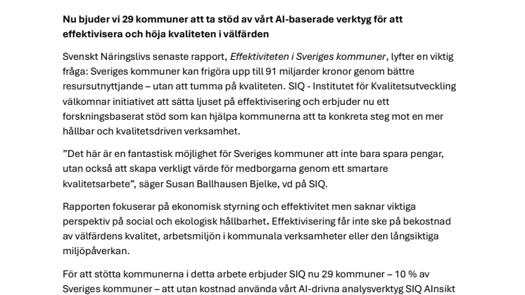 "Effektivisering handlar inte bara om att minska kostnader – det är en fråga om att systematiskt arbeta med kvalitet och innovation för att stärka kommunernas förmåga att utveckla värde över tid. Med SIQ AInsikt får kommuner en forskningsbaserad metod för att utveckla sin verksamhet på ett hållbart sätt," säger Anders Fundin, forskningsledare vid SIQ och professor vid Mälardalens universitet.
