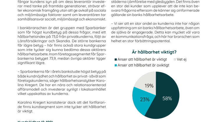 – Sparbankerna får i årets bankstudie högst betyg på både kundnöjdhet och hållbarhet av privat- såväl som företagskunderna, säger hållbarhetsanalytiker Karolina Kregert. De har en nära och relationsorienterad affärsmodell och investerar synligt i lokalsamhället vilket uppskattas av kunderna. Karolina Kregert konstaterar dock att det fortfarande finns kundsegment som inte tycker att hållbarhet är viktigt.