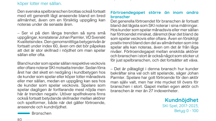 I november genomförde Svenskt Kvalitetsindex årets studie av kundnöjdhet och anseende inom spelbranschen, på uppdrag av Spelbranschens Riksorganisation (SPER). Det är sjunde året denna studie genomförs och i år noteras en liten uppgång i nöjdhet. Spridningen är dock stor. Kunder som spelar veckovis eller oftare är mycket nöjdare än kunder som spelar eller köper lotter mer sällan.