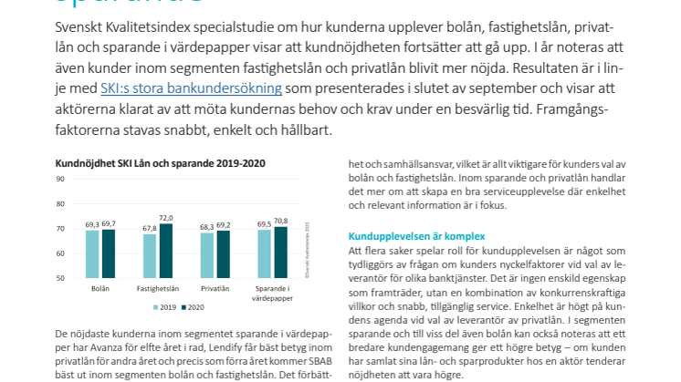 De nöjdaste kunderna inom segmentet sparande i värdepapper har Avanza för elfte året i rad, Lendify får bäst betyg inom privatlån för andra året och precis som förra året kommer SBAB bäst ut inom segmenten bolån och fastighetslån. Det förbättrade betyget för fastighetslån kan främst spåras till mer aktiva kundrelationer, förbättrat initiativtagande och god hantering av Covid-19.