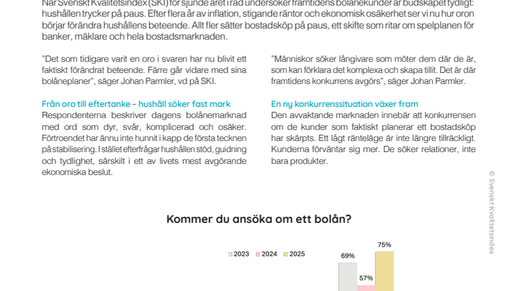 När Svenskt Kvalitetsindex (SKI) för sjunde året i rad undersöker framtidens bolånekunder är budskapet tydligt: hushållen trycker på paus. Efter flera år av inflation, stigande räntor och ekonomisk osäkerhet ser vi nu hur oron börjar förändra hushållens beteende. Allt fler sätter bostadsköp på paus, ett skifte som ritar om spelplanen för banker, mäklare och hela bostadsmarknaden.