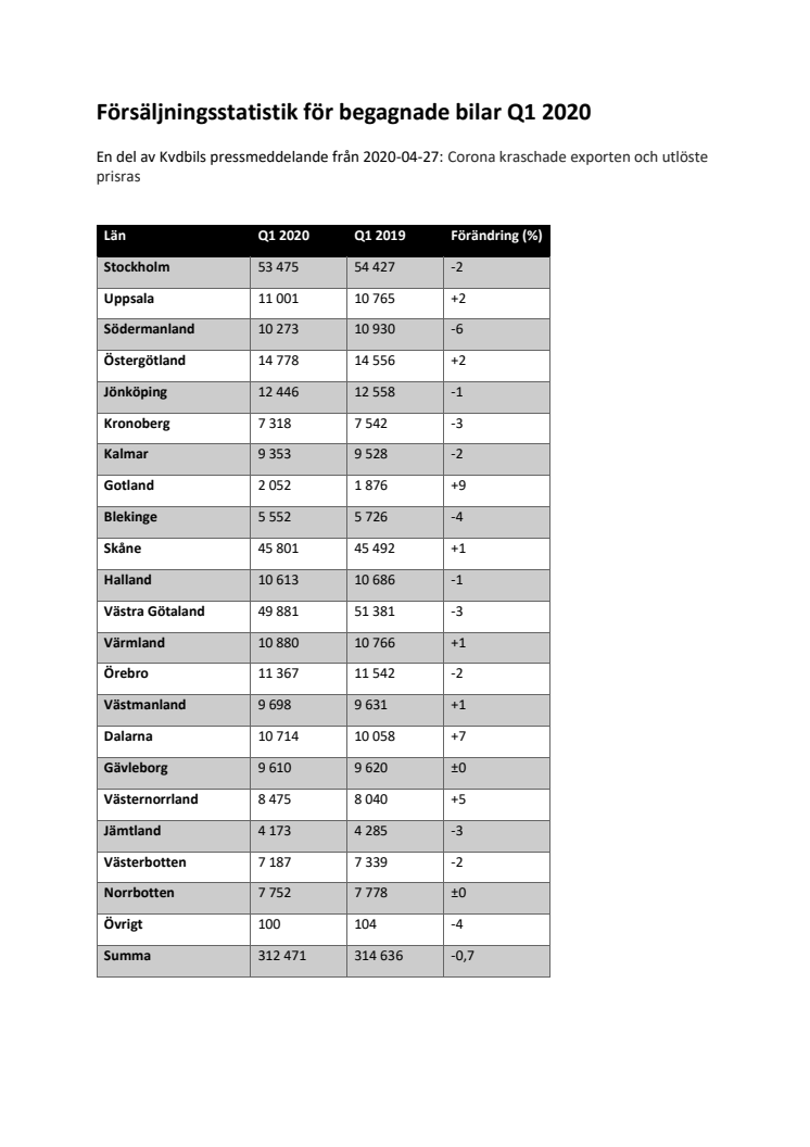 Försäljningsstatistik för begagnade bilar Q1 2020