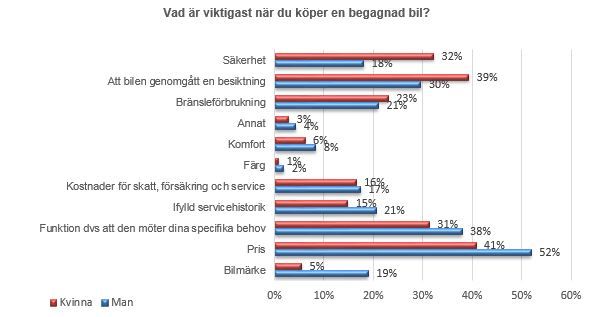 Män och kvinnor har olika preferenser när det gäller bilköp. Medan männen prioriterar bilmärke har kvinnorna fokus på säkerheten. Bilens färg är minst viktig för båda könen, även om dubbelt så många män som kvinnor prioriterar det. Det visar en ny Sifo-undersökning från bilauktionsföretaget KVD