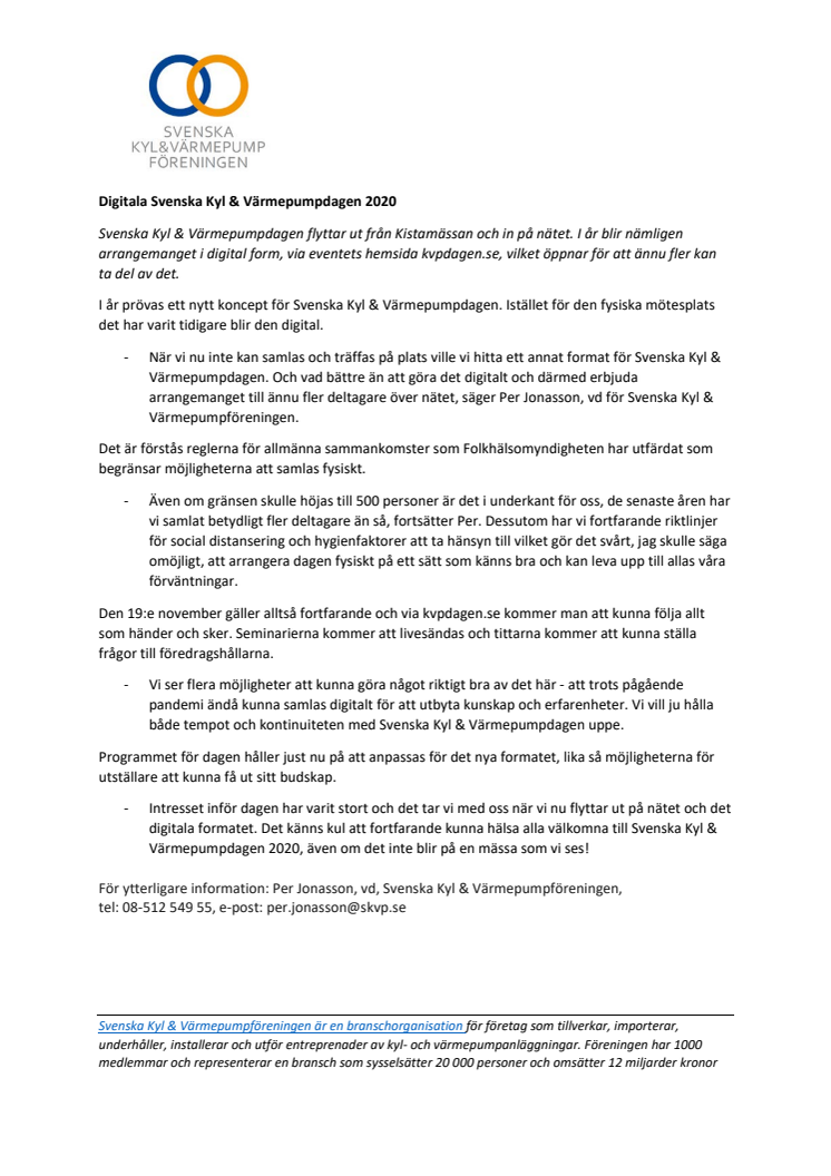 Digitala Svenska Kyl & Värmepumpdagen 2020