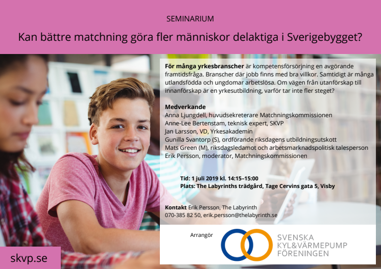 För många yrkesbranscher är kompetensförsörjning en avgörande framtidsfråga. Branscher där jobb finns med bra villkor. Samtidigt är många utlandsfödda och ungdomar arbetslösa. Om vägen från utanförskap till innanförskap är en yrkesutbildning, varför tar inte fler steget? Detta diskuteras under SKVPs seminarium den 1 juli i Almedalen. Varmt välkommen!