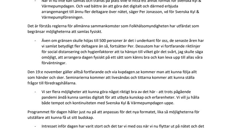 -Vi ser flera möjligheter att kunna göra något riktigt bra av det här - att trots pågående pandemi ändå kunna samlas digitalt för att utbyta kunskap och erfarenheter. Vi vill ju hålla både tempot och kontinuiteten med Svenska Kyl & Värmepumpdagen uppe.