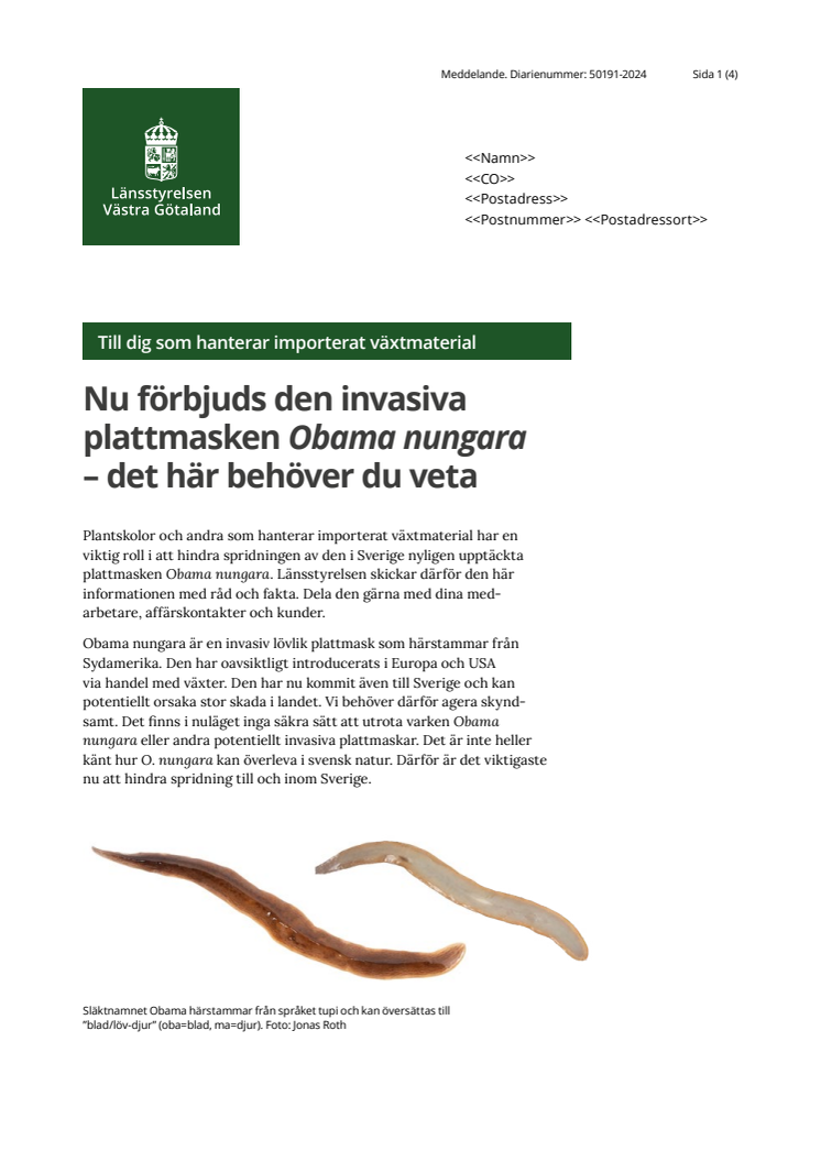 Plantskolor och andra som hanterar importerat växtmaterial har en viktig roll i att hindra spridningen av den i Sverige nyligen upptäckta plattmasken Obama nungara. Länsstyrelsen skickar därför den här informationen med råd och fakta. December 2024.