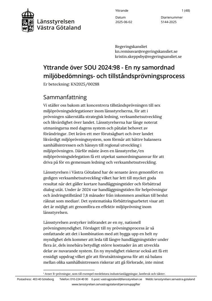 Yttrande om en ny samordnad miljöbedömnings- och tillståndsprövningsprocess