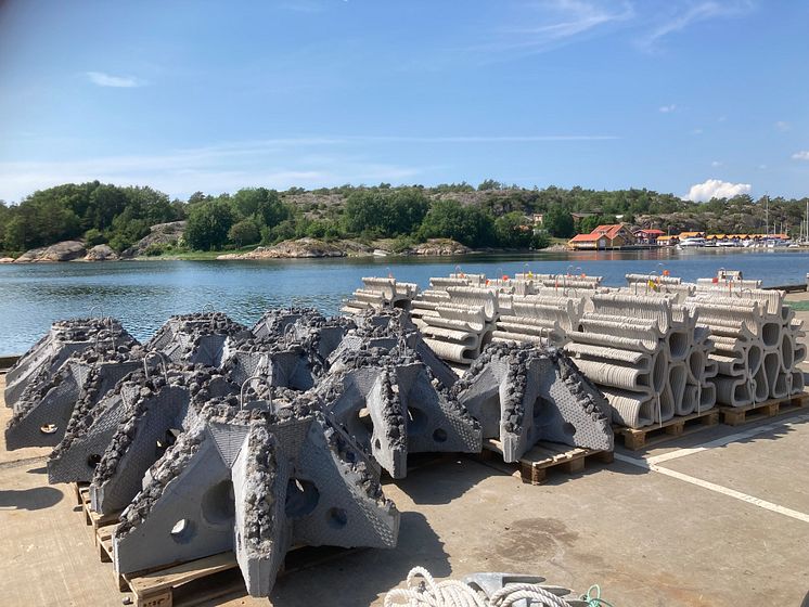 De flesta reven är gjutna i betong som en stjärna med sex armar. Genom att blanda in slaggcement i betongen blev tillverkningen mer miljövänlig med lägre CO2-utsläpp. Dessutom har några rev producerats i en 3D-printer för en mer organisk form (till höger). Foto: Anita Tullrot, Länsstyrelsen Västra Götaland
