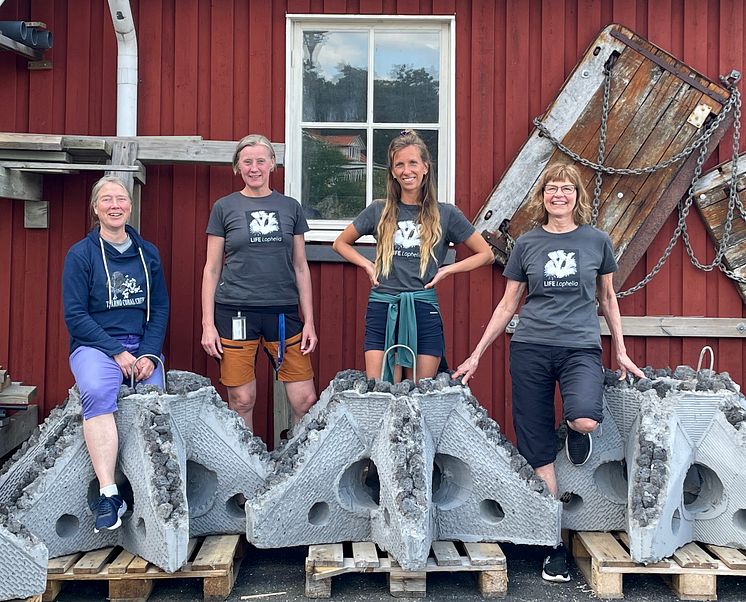 Glada över att betongreven ska sjösättas är, från vänster: Ann Larsson, Susanna Strömberg och Iga-Maria Nestorowicz från Göteborgs universitet, samt Anita Tullrot från Länsstyrelsen i Västra Götaland.