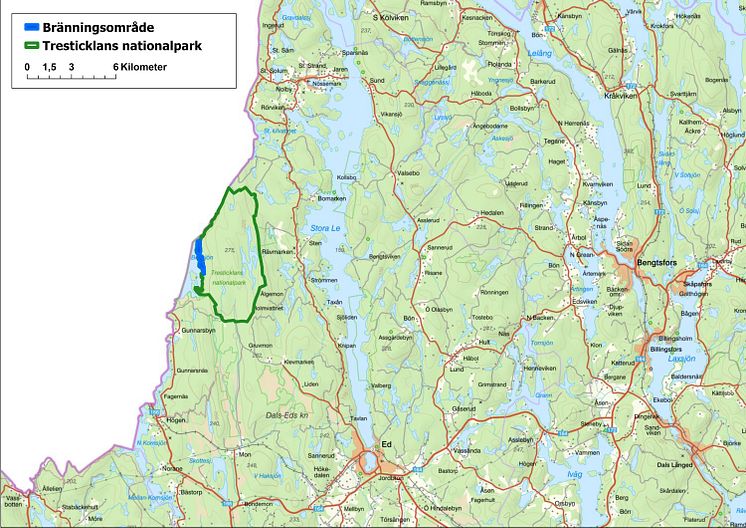 Tresticklans nationalpark. Blåmarkerat fält är område där bränning planeras.
