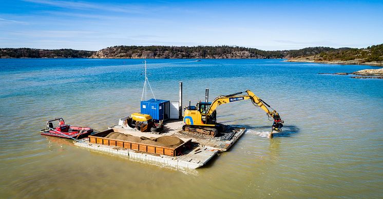 Utläggningen av sand gjordes med grävskopa som stod på en pråm. Foto: Eduardo Infantes.