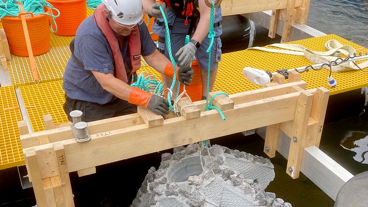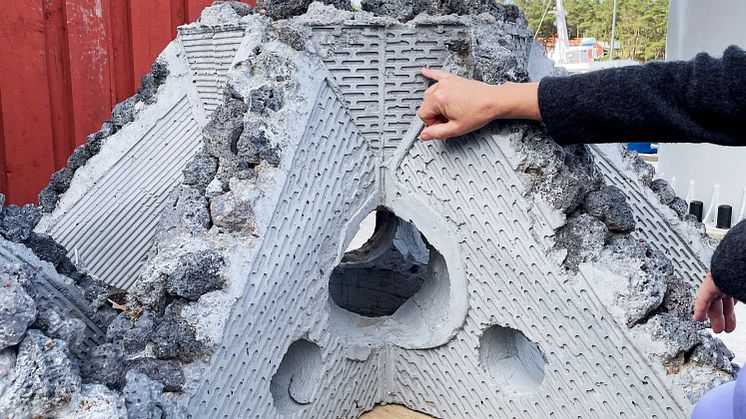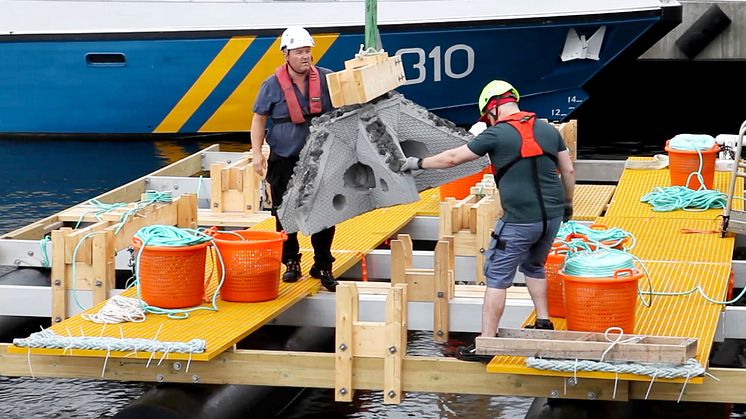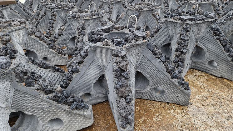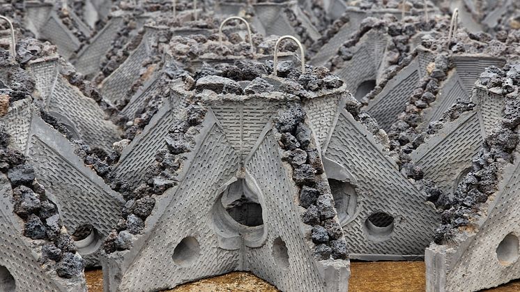 - Revfundamenten är tillverkade av betong, 132 stycken är gjutna i Göteborg och 28 rev är 3D-printade i betong i Stockholm. Tillverkningen sker utifrån forskningsresultaten och på uppdrag av Länsstyrelsen i Västra Götaland, LIFE Lophelia-projektet.