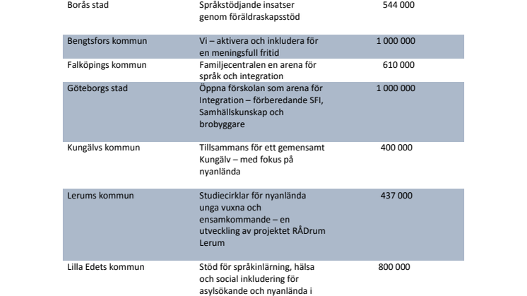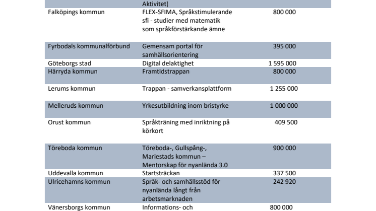 Integrationscentrum i Göteborgs stad har beviljats pengar för att stärka nyanländas digitala delaktighet, och Skara kommun för att anställa en kommunvägledare och familjeguide för nyanlända och asylsökande.