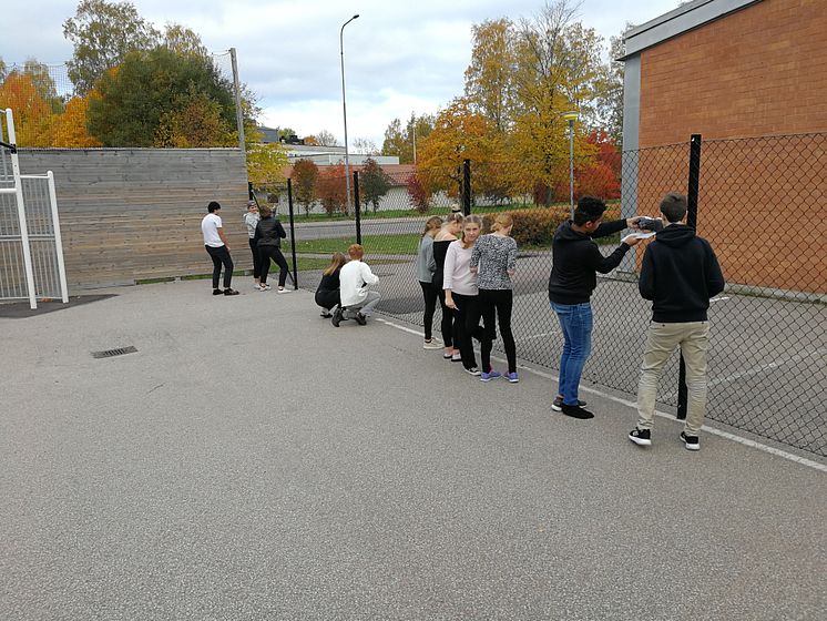 Elever på Erlaskolan i Falun mäter ute på skolgården.