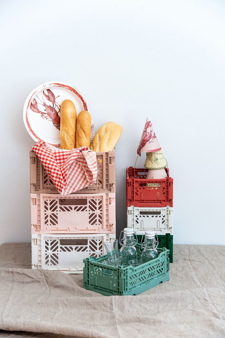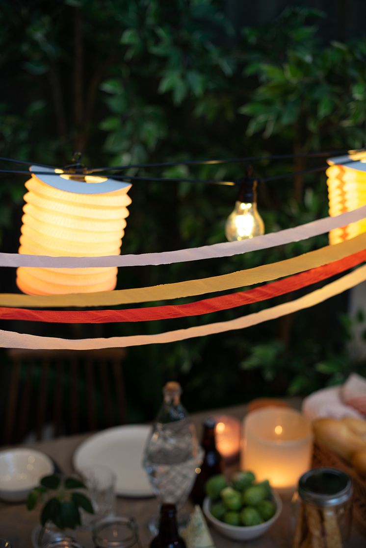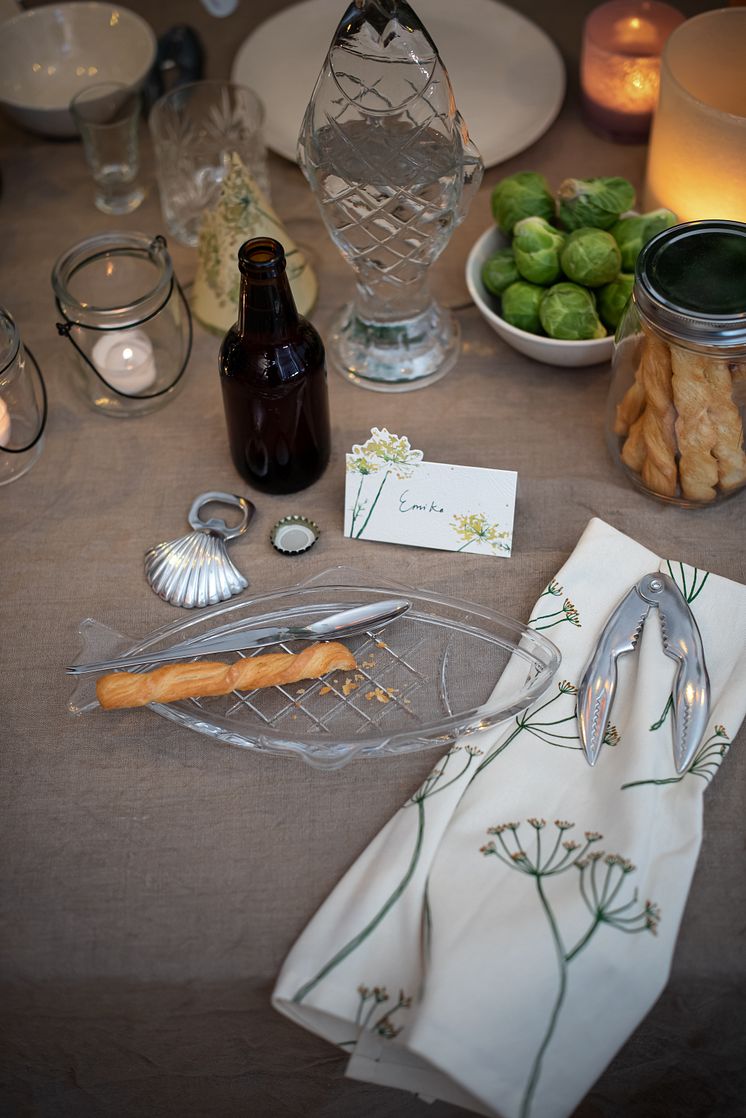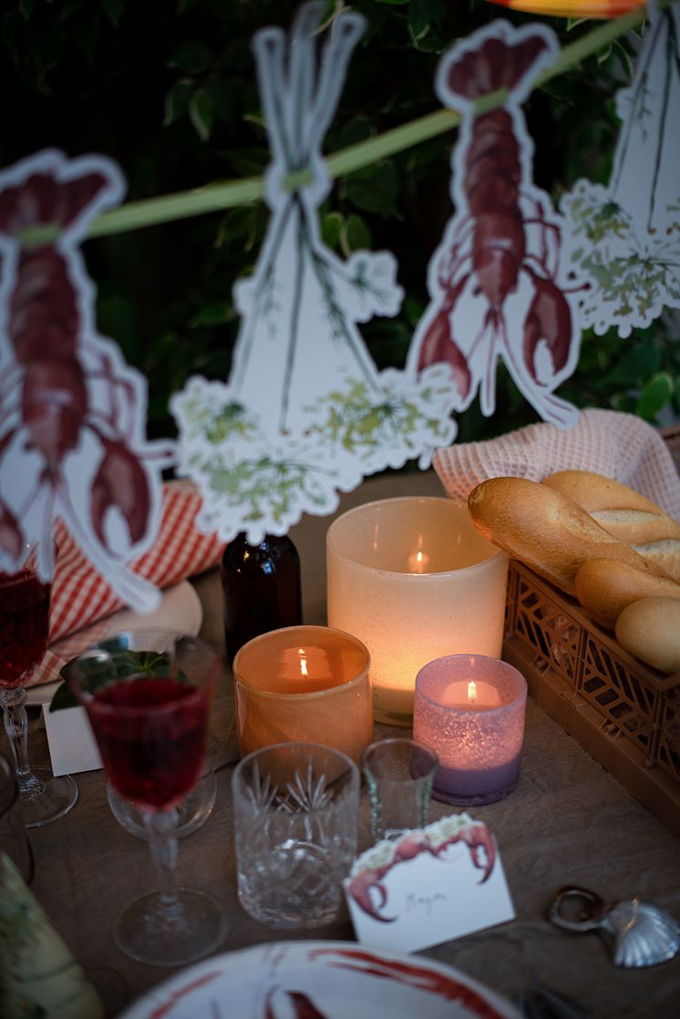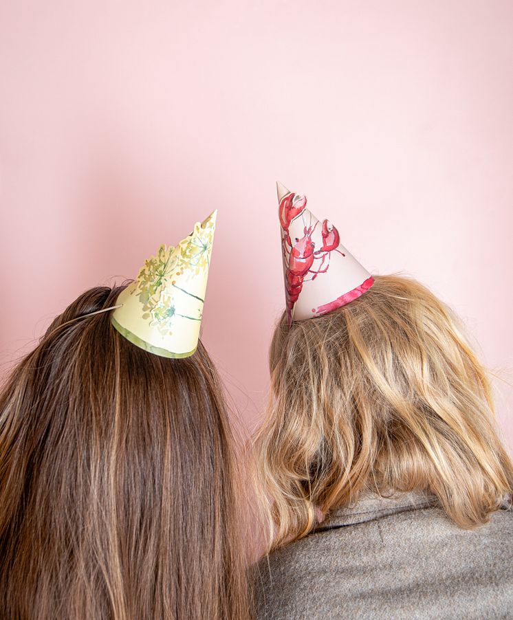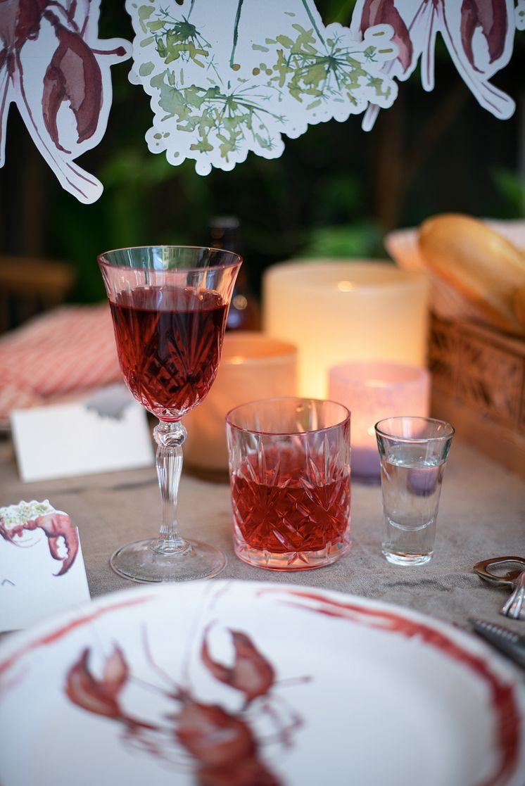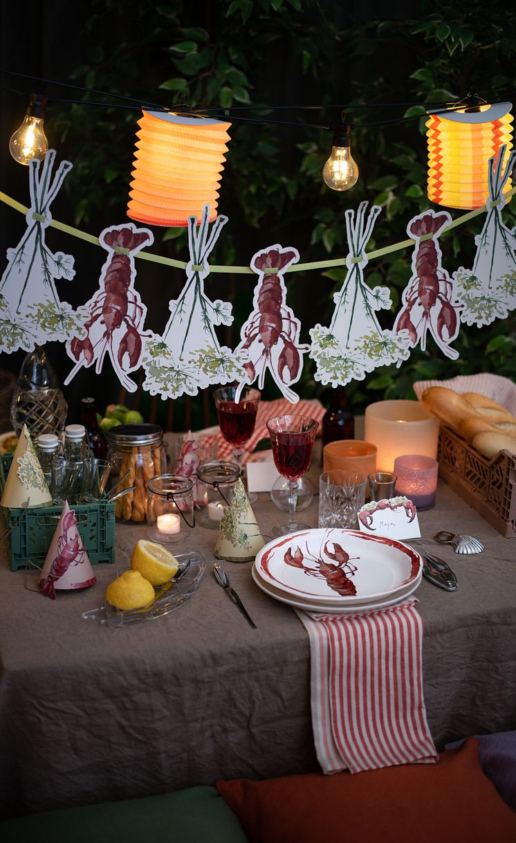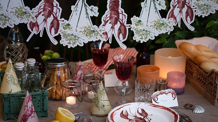 Dillbuketten återkommer i mönsterform på flertalet produkter, till exempel servetter, kökshandduk och placeringskort. För att dukningen ska bli extra festlig så finns girlang och partyhattar - samtliga i vackert kräft- och dillmönster. En nyhet att spana in lite extra är de stämningsfulla papperslaternorna.