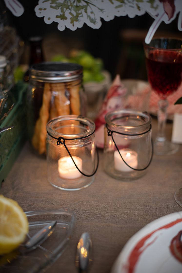 Addera produkter från Lagerhaus bassortiment för att göra dukningen komplett. Ljuslyktor i olika storlekar, glasburkar, glasflaskor, stora och små vaser samt ljusslingor att hänga över bordet.
