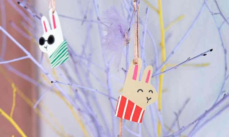 Dekorera påskriset med charmiga pappershängen, tylltofsar och vackra glasägg.