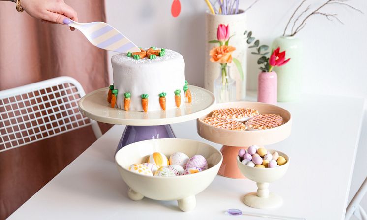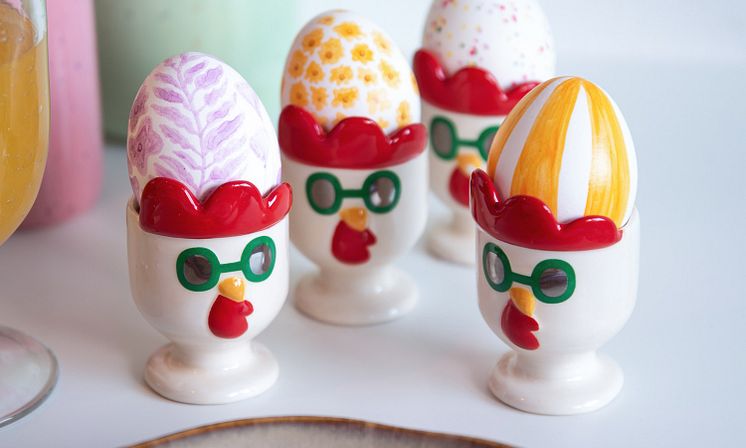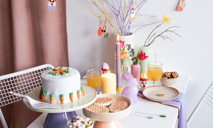 Kollektionen är fylld av färgsprakande produkter för påskfirandet. Detaljer för påskriset, godsaker och presentpåsar för påskpresenten och mängder av fina inredningsdetaljer i vårens tema. En exploderande färgskala i lila och gult blandas med mer jordnära toner. Det grönskande mönstret BUKETT, tuppen HENRY och kaninen BONNIE står för vårens mönster.
