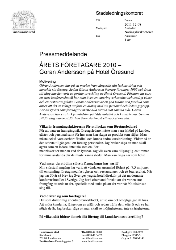 ÅRETS FÖRETAGARE 2010 – Göran Andersson på Hotel Öresund