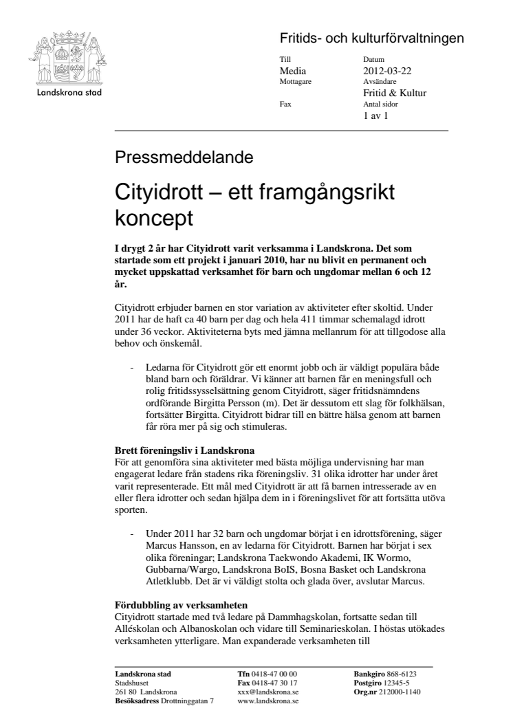 I drygt 2 år har Cityidrott varit verksamma i Landskrona. Det som startade som ett projekt i januari 2010, har nu blivit en permanent och mycket uppskattad verksamhet för barn och ungdomar mellan 6 och 12 år.