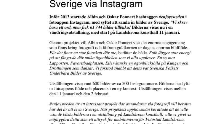 Inför 2013 startade Albin och Oskar Ponnert hashtaggen #enjoysweden i fotoappen Instagram, med syftet att samla in bilder av Sverige. ”Vi skrev bara ett ord, men fick 61 744 bilder tillbaka! Bilderna visas nu i en vandringsutställning, med start på Landskrona konsthall 11 januari.
