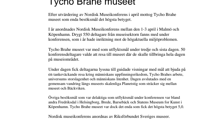 Övriga besöksmål som var delaktiga som utflyktsmål under konferensen var bland andra Fredriksdal i Helsingborg, Brede, Barsebäck och Statens Museum for Kunst i Köpenhamn. Tycho Brahe museet var dock det enda som fick det högsta betyget 5,0.