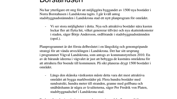 Nu har ytterligare ett steg för att möjliggöra byggandet av 1500 nya bostäder i Norra Borstahusen i Landskrona tagits. I går kväll antog stadsbyggnadsnämnden i Landskrona stad ett nytt planprogram för området.