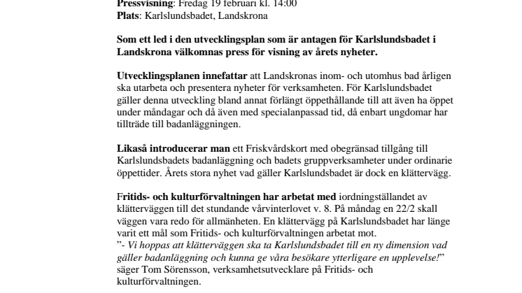 Likaså introducerar man ett Friskvårdskort med obegränsad tillgång till Karlslundsbadets badanläggning och badets gruppverksamheter under ordinarie öppettider. Årets stora nyhet vad gäller Karlslundsbadet är dock en klättervägg.