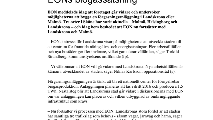 EON meddelade idag att företaget går vidare och undersöker möjligheterna att bygga en förgasningsanläggning i Landskrona eller Malmö. Tre orter i Skåne har varit aktuella - Malmö, Helsingborg och Landskrona - och idag kom beskedet att EON nu fortsätter med Landskrona och Malmö.