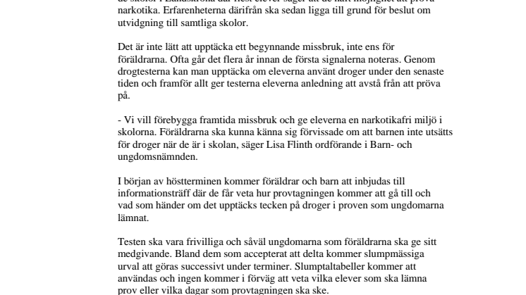 - Vi vill förebygga framtida missbruk och ge eleverna en narkotikafri miljö i skolorna. Föräldrarna ska kunna känna sig förvissade om att barnen inte utsätts för droger när de är i skolan, säger Lisa Flinth ordförande i Barn- och ungdomsnämnden.