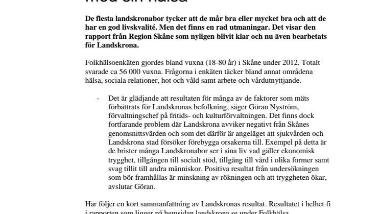 - Det är glädjande att resultaten för många av de faktorer som mäts förbättrats för Landskronas befolkning, säger Göran Nyström, förvaltningschef på fritids- och kulturförvaltningen. Det finns dock fortfarande problem där Landskrona avviker negativt från Skånes genomsnittsvärden och som det därför är angeläget att sjukvården och Landskrona stad försöker förebygga orsakerna till. Exempel på detta är de brister många Landskronabor ser i sina liv vad gäller ekonomisk trygghet, tillgången till socialt stöd, tillgång till vård i olika former samt svag tillit till andra människor. Positiva resultat från undersökningen som bör framhållas är minskning av rökningen och att tryggheten ökar, avslutar Göran.