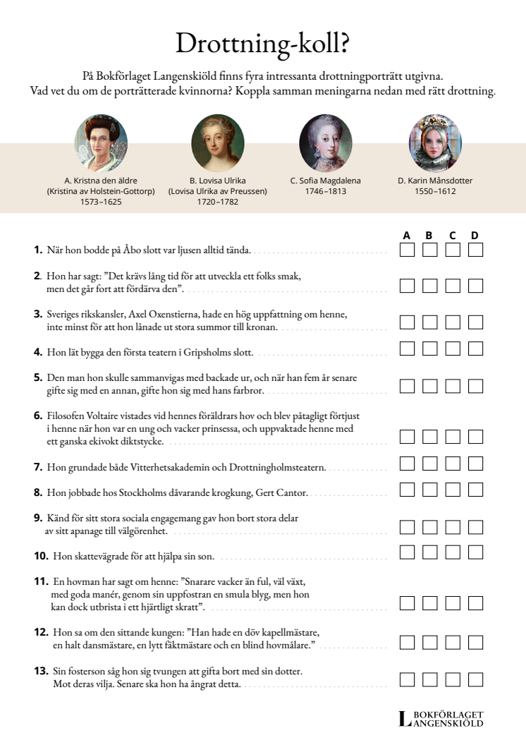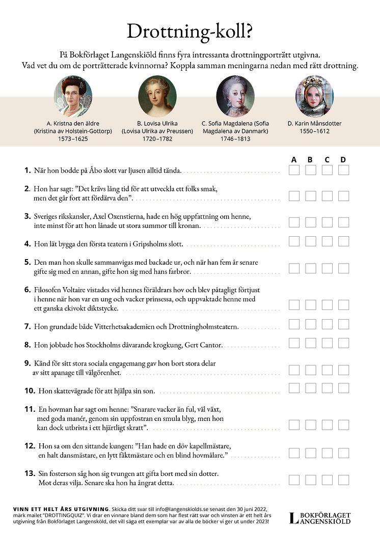 Bokförlaget Langenskiöld utlyser nu en spännande tävling med anledning av att man publicerat fyra böcker om svenska drottningar. Svaren ska skickas till info@langenskiolds.se senast den 30 juni 2022, märk mailet "DROTTINGQUIZ". Vi drar en vinnare bland dem som har flest rätt svar och vinsten är ett helt års utgivning från Bokförlaget Langensköld, det vill säga ett exemplar var av alla de böcker vi ger ut under 2023!