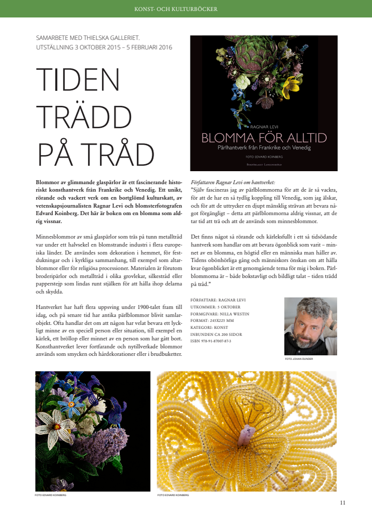 Blomma för alltid är ett unikt, rörande och vackert verk om en bortglömd kulturskatt, av vetenskapsjournalisten Ragnar Levi och blomsterfotografen Edvard Koinberg. Blomman, symbolen för det förgängliga, får i detta fascinerande konsthantverk evigt liv. Boken släpps i samband med Thielska Galleriets vernissage om pärlblommor den 3 oktober.