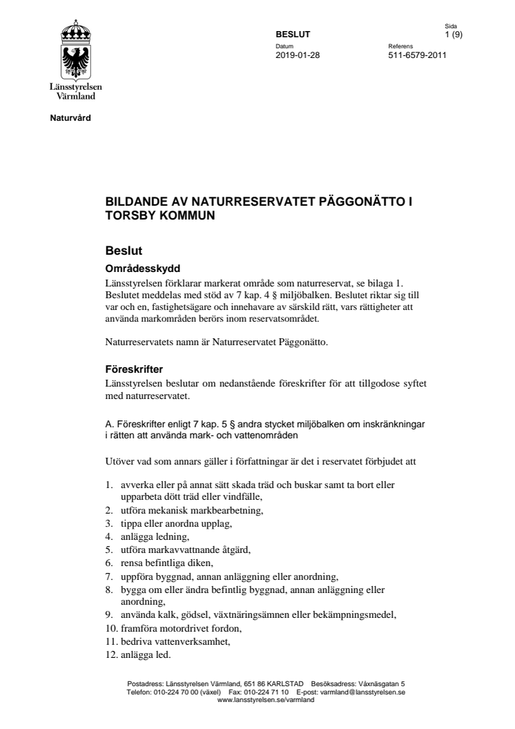 Beslut - bildandet av naturreservatet Päggonätto i Torsby kommun