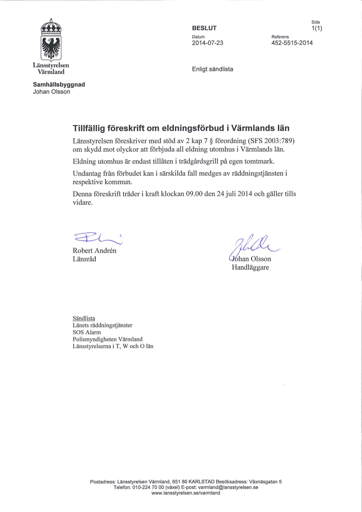 Beslut om eldningsförbud i Värmlands län 2014-07-24
