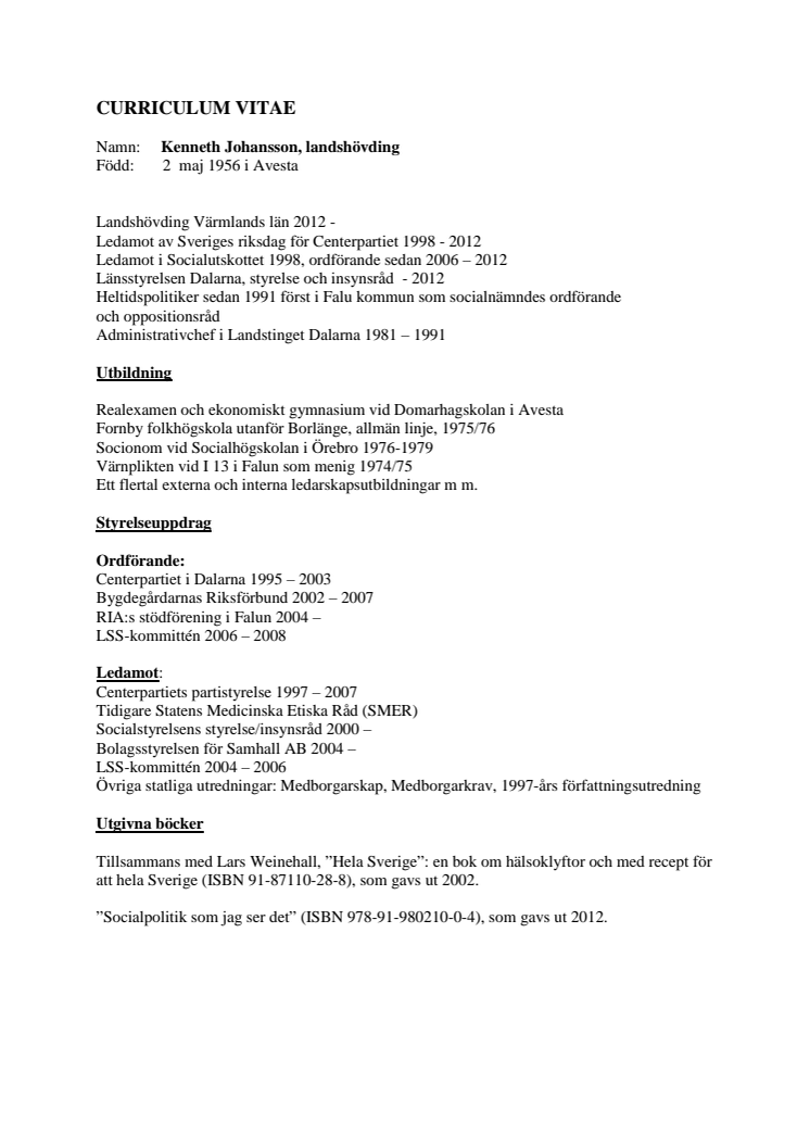 Landshövding Kenneth Johanssons CV 2012